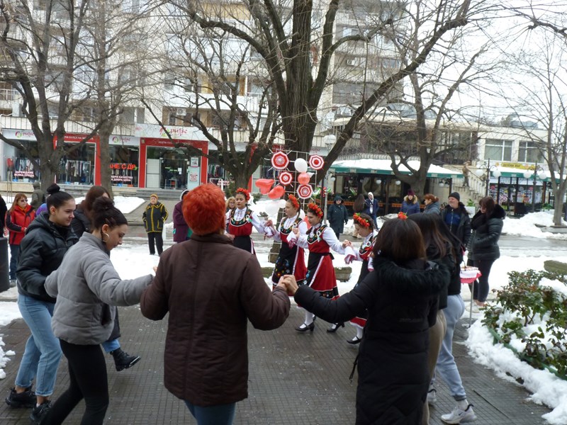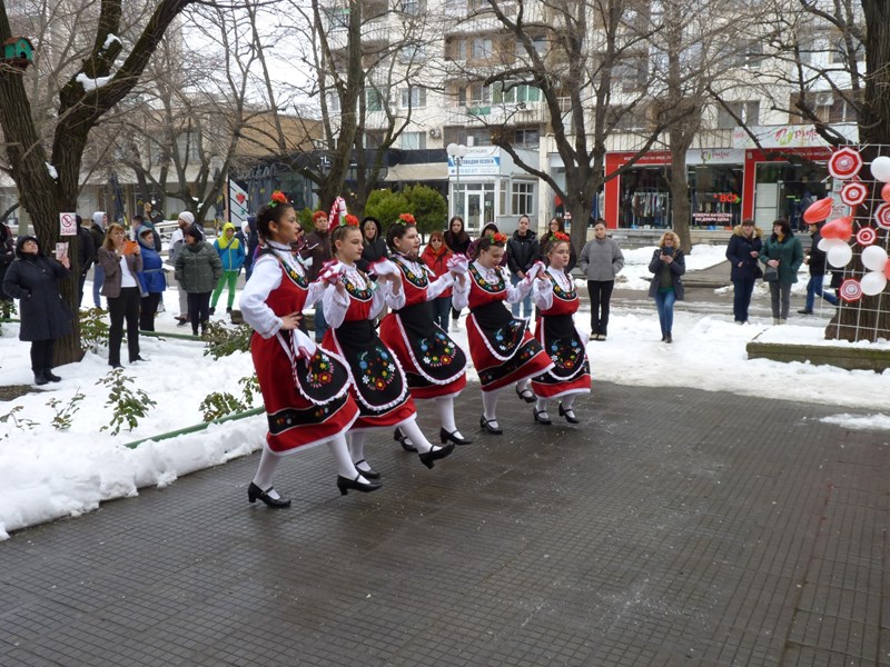 Въпреки мразовитото и мъгливо време, младежите успяха да стоплят сърцата на минувачите с ентусиазма си. Момичетата изиграха няколко български хора, докато техни съученици раздаваха ръчно изработени мартенички и сувенири за Баба Марта на преминаващите граждани.