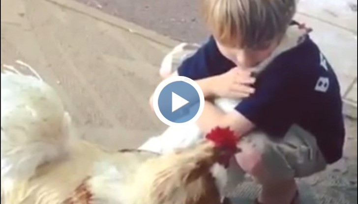 В него се вижда как малко момченце прегръща голяма бяла кокошка. Животинката буквално се сгуши в момченцето и се остави на ласките му.