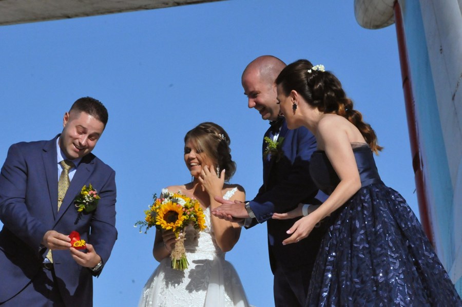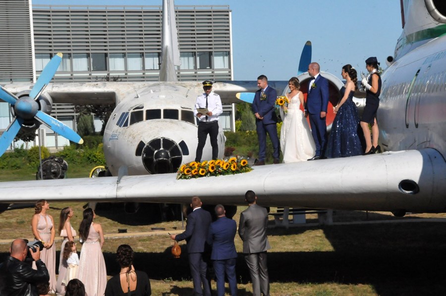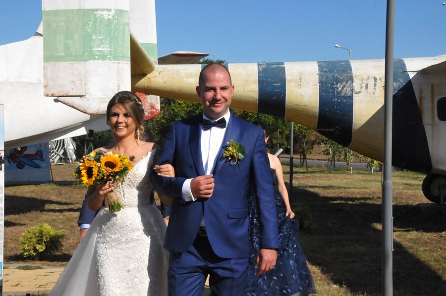 Нетрадиционната церемония събра близки и приятели на младоженците навръх днешния национален празник - Деня на независимостта в Авиомузея в Бургас.