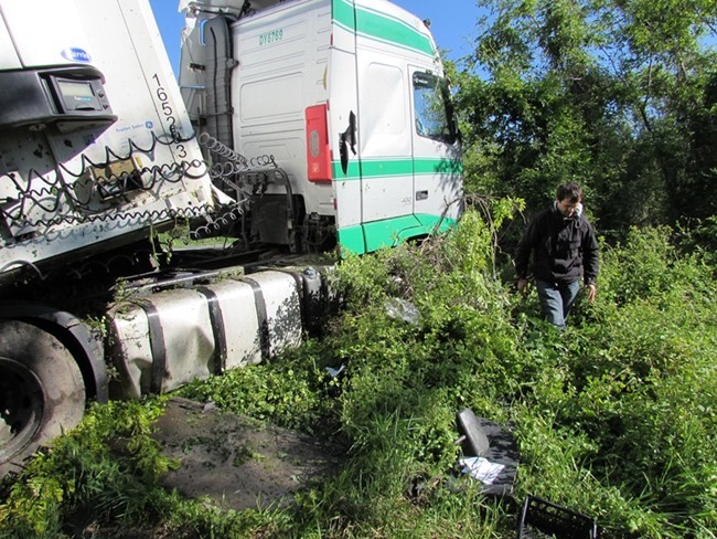 Тирът направо се сгънал на две, но без да затваря пътя. Измерената алкохолна проба на молдовския шофьор надхвърля 2 промила.
