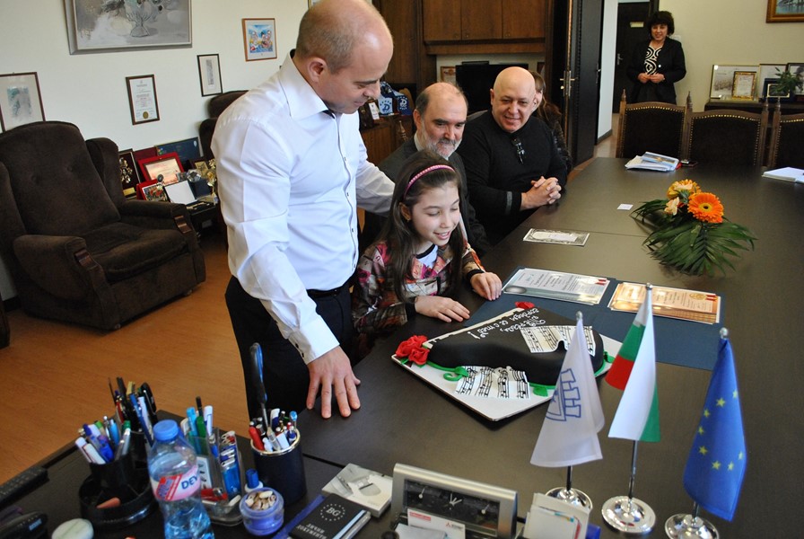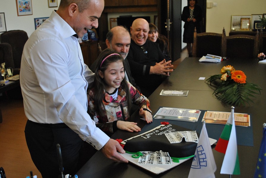 Малката Тереза получи и сладък подарък от кмета на Община Русе – торта, под формата на пиано, с която г-н Стоилов изказа своята радост и гордост от постиженията на талантливата русенка, която прославя града не само в България, но и в чужбина.
