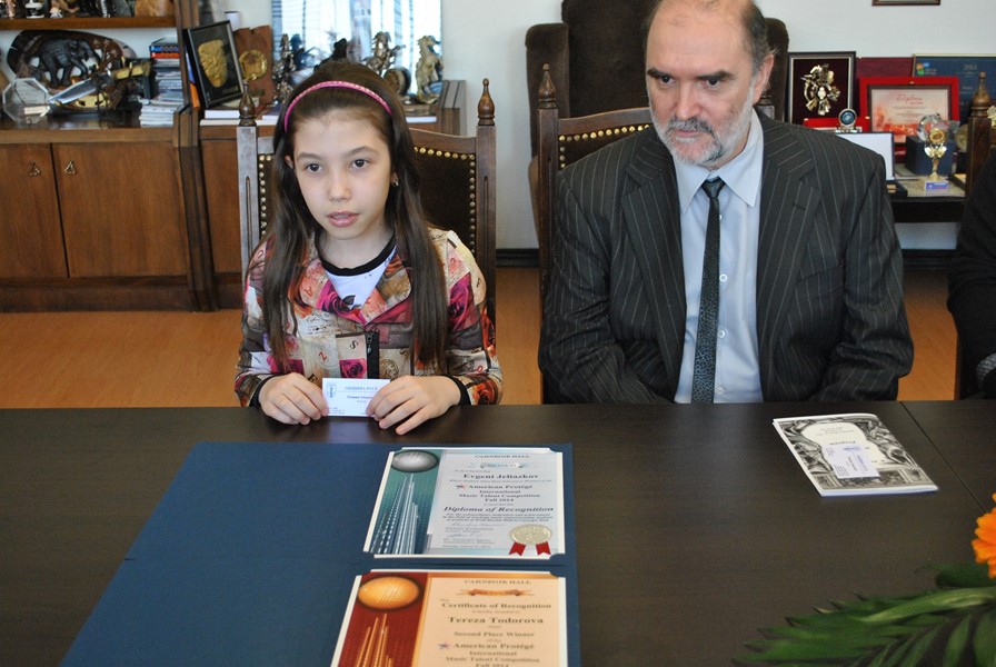 Днес кметът Пламен Стоилов посрещна талантливата Тереза Тодорова, която преди броени дни се завърна от Ню Йорк. 10-годишната пианистка взе участие в Гала концерта на победителите от Международния конкурс „Американ протеже“ в прочутата зала „Карнеги хол“.