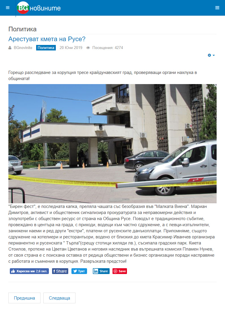Публикацията е със заглавие: „Арестуват кмета на Русе?“ и е направена от сайта bgnovinite.eu, който не е посочил нито авторите си, нито собствениците си.