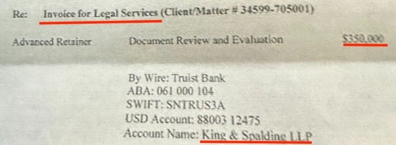 В началото на декември 2022 г. по банкова сметка на кантората „King & Spalding LLP“ в Truist Bank постъпват 350 000 долара като основание за превода е посочено преглед и оценка на документи. Тази сума не е декларирана в отчетите, които американските лобисти на Цветан Василев подават на всяко тримесечие и е отделна от хонорарите – по около 50 000 долара годишно, които бившият банкер плаща на адвокатските кантори в САЩ.