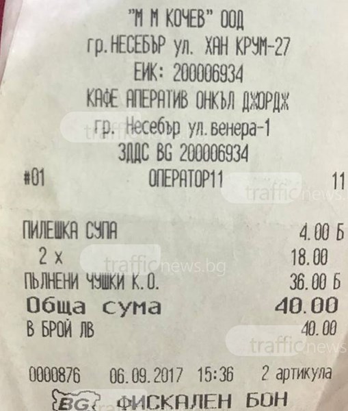 Така лаконично читателка на TrafficNews ни призова да публикуваме един касов бон, който, меко казано, доста ни смути и почти щеше да ни развесели, ако не беше всъщност тъжно. Тъжно, защото на фона на стандарта на обикновения българин цена от 18 лева за порция пълнени чушки е направо абсурдна.