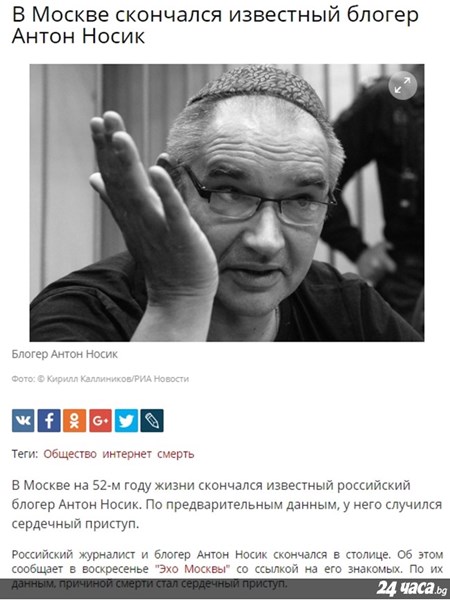 "Да, това е вярно. Антон Носик почина миналата нощ в Москва", написа във Фейсбук един от приятелите му, публицистът Демян Кудрявцев.