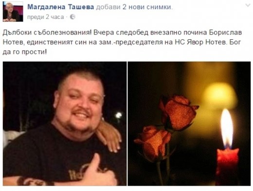 "Дълбоки съболезнования! Вчера следобед внезапно почина Борислав Нотев, единственият син на зам.-председателя на НС Явор Нотев. Бог да го прости!".