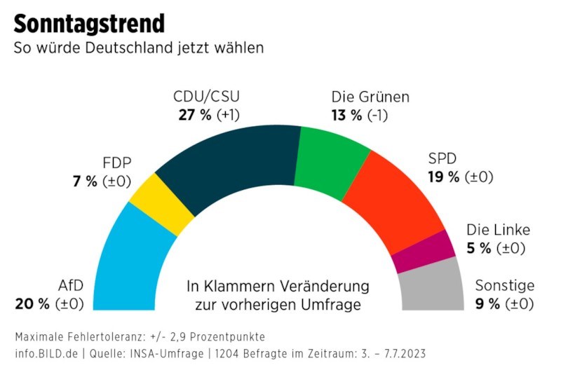 Проучването отчита, че с най-голямо доверие се ползва десния опозиционен блок между Християндемократическия съюз и Християн социалния съюз (CDU/CSU) - 27%, следван от AfD с 20%, докато доверието в SPD на канцлера Шолц е 19%, а в другия коалиционен партньор Зелените - 13% и в третия управляващ младши партньор Свободна демократическа партия (FDP) - 7%.