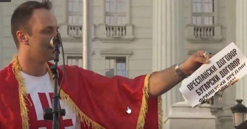 Ламбе Алабаковски, който подпали входната врата на българския клуб "Иван Михайлов" в Битоля, тази вечер изгори демонстративно в Скопие Договора с България, Преспанското споразумение и френското предложение