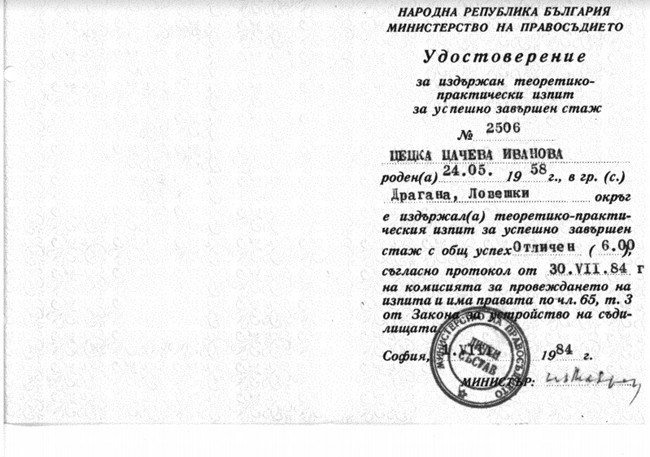 ПП ГЕРБ предоставят също и удостоверение от положения пред Министерството на правосъдието теорeтикo-практически изпит за получаване на правоспособност на Цецка Цачева.