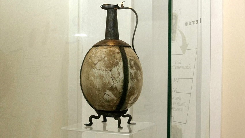 Преди поставянето на съда, изработен от черупката на яйце на екзотичното животно, той е утилитарно или ритуално разглобен, а металните му части са отстранени. Какви са причините, накарали погрижилите са за изпращането на покойника да извършат тези действия, остава загадка.