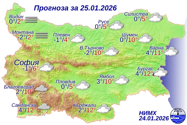 Максималните температури в страната ще варират в широки граници – от 3° в мъгливите райони до пролетните 12° по Черноморието. За София термометрите ще покажат около 6 градуса в най-топлата част на деня, но усещането ще остане по-хладно заради облачността.