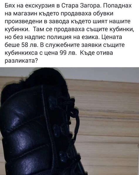 В служебните заявки същите кубинки са 99 лева. Къде отива разликата?"