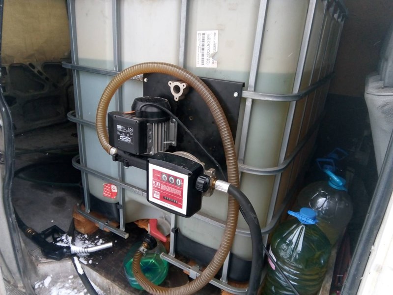 В товарния отсек на микробуса полицейските служители установили пластмасов модул, съдържащ около 800 литра дизелово гориво, с монтирана помпа с брояч и пистолет за зареждане.