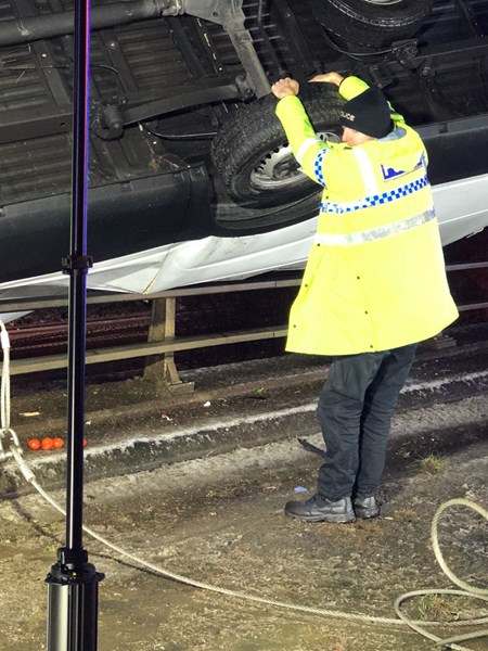 Полицай удържа минибус да не падне от мост