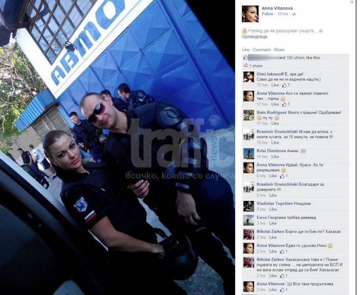 Въпросната дама, която продължава да е служител на Специализираните полицейски сили, въпреки разследванията срещу нея, публикува меко казано расистки постове в социалната мрежа Фейсбук. Вчера вечерта тя публикува снимка със свой колега, като на нея двамата са в униформи. От фотоса става ясно, че са в кв. „Орландовци“, където точно по това време имаше протест на българи срещу роми, живеещи нелегално в квартала. Над снимката Витанова е написала „feeling да ни развържат ръцете“. Постъп предизвиква оживена дискусия сред приятелите на Витанова.