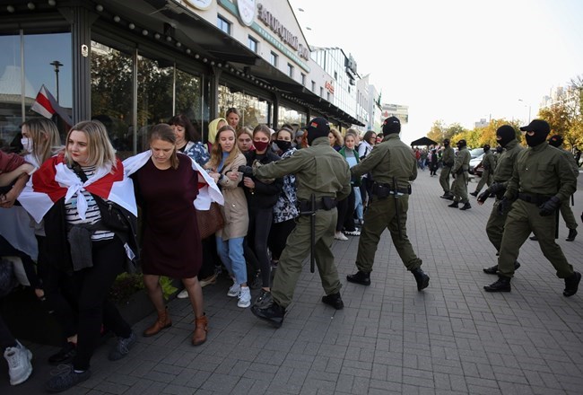 В събота полицията за борба с безредиците задържа стотици жени, вкарвайки много от тях във фургони, докато протестиращите от опозицията преминаха през столицата на Беларус Минск с искане за прекратяване на управлението на президента Александър Лукашенко, предаде Франс прес, цитирана от БГНЕС.