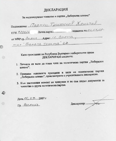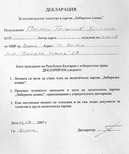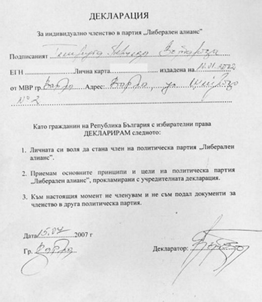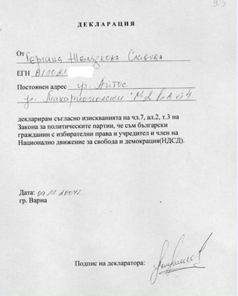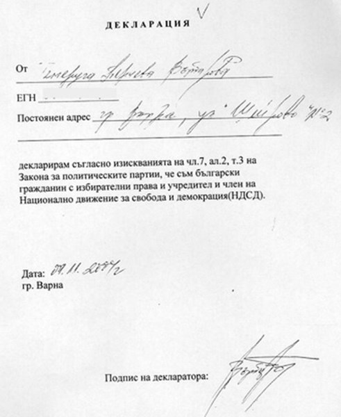 Това показа преглед на декларациите за индивидуално членство на учредителите на НДСД и „Либерален алианс“ (прекръстена на „Воля“), копия на които могат да бъдат намерени в Софийския градски съд.