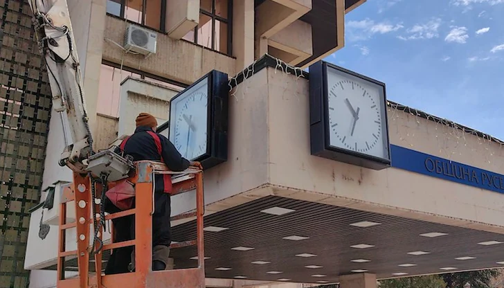Часовниците над централния вход на сградата, приютяваща Община Русе и Областната администрация, вече работят изрядно. Специалисти подмениха и свериха механизмите днес, за да възстановят нормалното им функциониране.