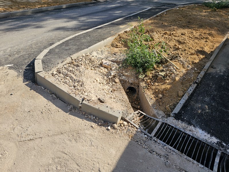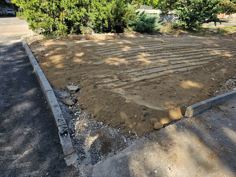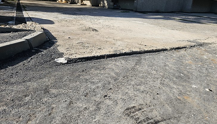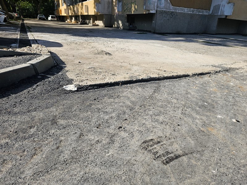 На втората снимка се вижда, че част от бордюрите на тротоара липсват, а фракцията от стария асфалт е изсипана в тревната площ около блока, вместо да бъде извозена до депо. На следващия ден върху тези камъни е изсипана пръст, за да се прикрие фактът, че не са били извозени. Този метод на работа не само е непрофесионален, но и показва пълно пренебрежение към естетиката и безопасността на района.