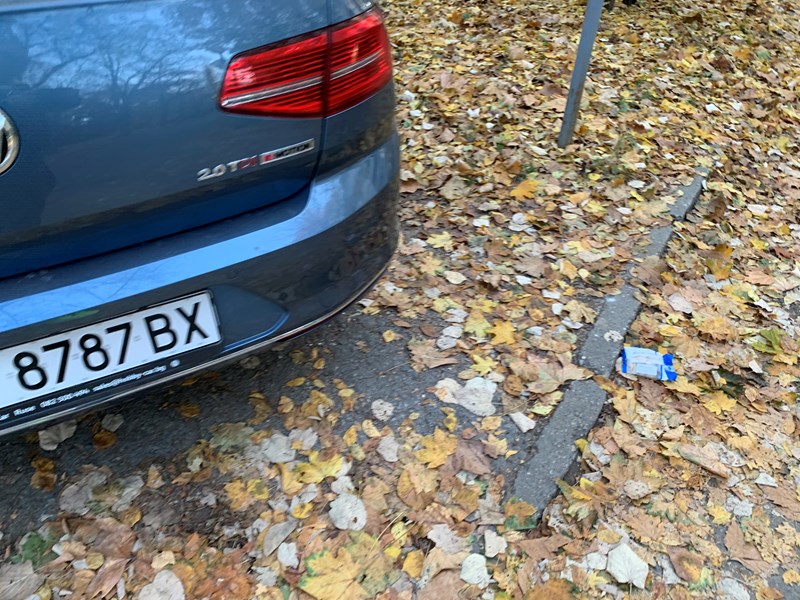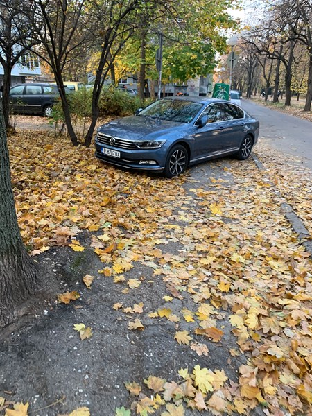 Улица "Алеи Възраждане" №16, паркингът пред блока наполовина е празен, но този "тарикат" е паркирал така, че нито по тротоара да може да се мине, нито да се излезе безопасно от паркинга с автомобил.
