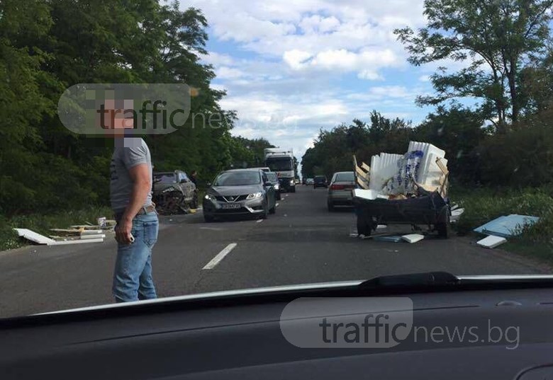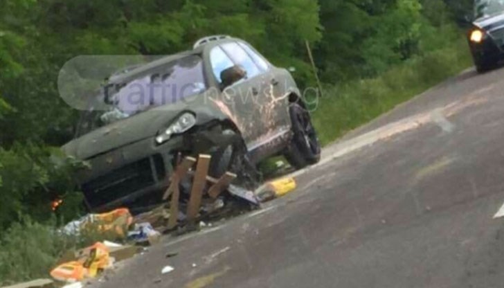 Поршето най-вероятно се е ударило в ремаркето на друг автомобил, превозващ строителни материали. Такива са разпиляни по целия път. Ремаркето е от едната страна на пътя, а Поршето - в тревата от другата му страна. Инцидентът сериозно е затруднил движението и колони от автомобили са се образували и от двете страни.