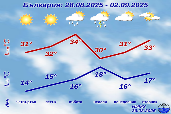 В четвъртък, петък и през по-голямата част от деня в събота ще преобладава слънчево време в България. Температурите ще се повишават постепенно и в събота максималните стойности ще достигнат между 32° и 37°, съобщава Националният институт по метеорология и хидрология в седмичната си прогноза за периода 28 август - 2 септември.