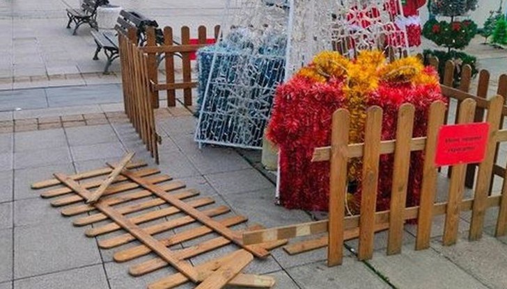 Неизвестни са потрошили дървената ограда, която опасва конструкцията тип „елха“ и големите подаръци. Не е ясно кому е пречила, нито защо точно там е трябвало да се излее агресията на вандалите.