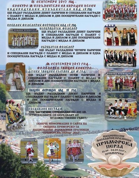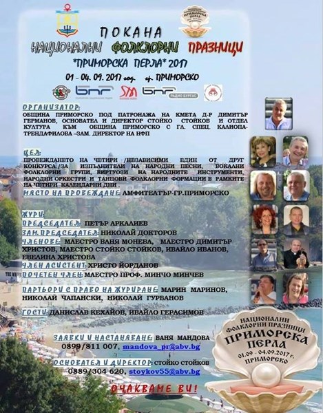 От 1 до 4 септември 2017 година в град Приморско ще се проведе третото издание на Национални фолклорни празници „Приморска перла“ 2017 под патронажа на д-р Димитър Германов кмет на община Приморско с основател и директор маестро Стойко Стойков.