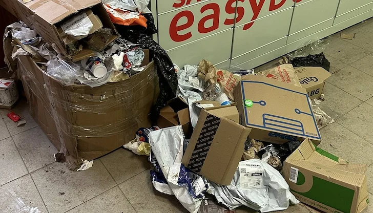 "Вътре е потресаваща кочина от боклуци", алармира Лора Василева в групата "Забелязано в Русе". На предоставената от нея снимка се вижда, че пространството пред автоматите "Sameday Easybox" е буквално затрупано от разкъсани опаковки, празни кашони от "eMAG", "Ozone" и битови отпадъци.