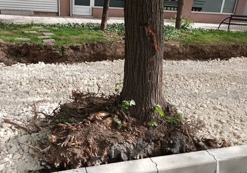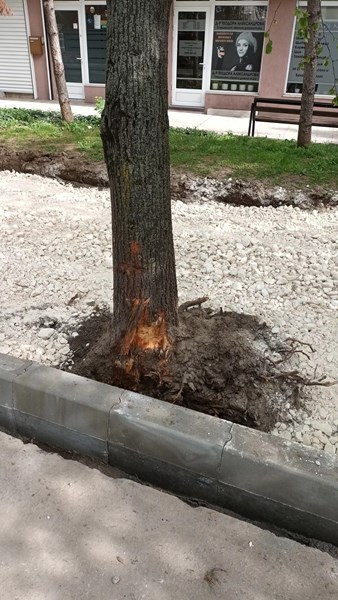 Към поста са публикувани снимки, показваща дърво с наранен ствол край улица "Ниш", където се вижда положен нов бордюр в непосредствена близост до дървото. Ясно се забелязват следи от механични увреждания по стъблото.