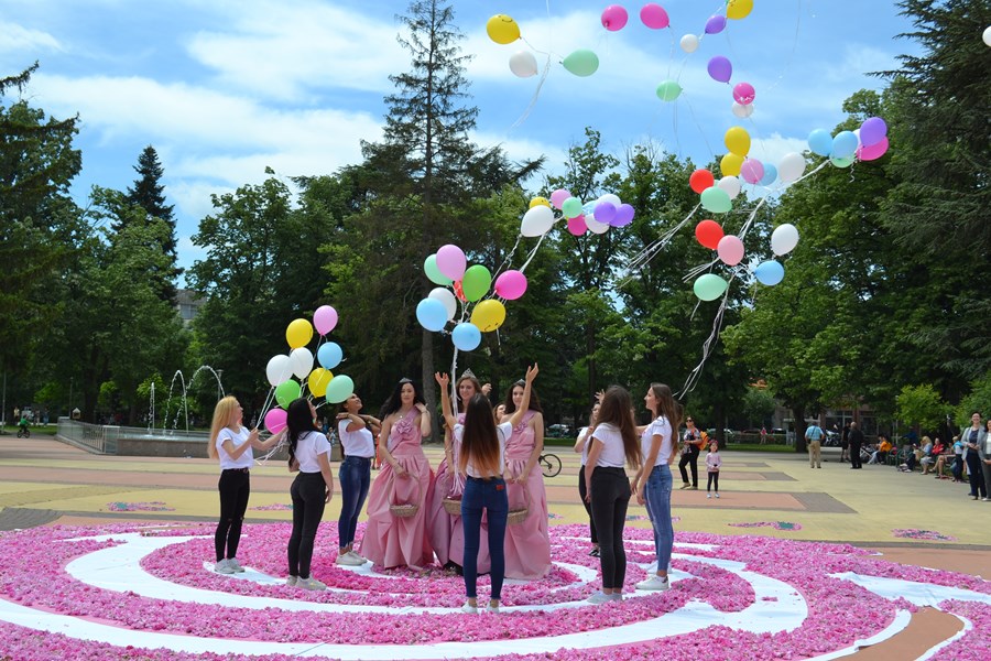 Царица Роза 2020 Мария Петрова и нейните подгласнички Сузан Иглева и Стефани Кръстева, които казанлъчани за първи път избраха виртуално, обградени от всички смели абитуриентки, дръзнали да се включат в онлайн надпреварата за короната, заедно отправиха поздрав към своите съграждани с много розов цвят и пъстри балони в небето над Казанлък.