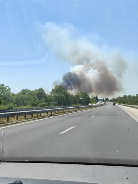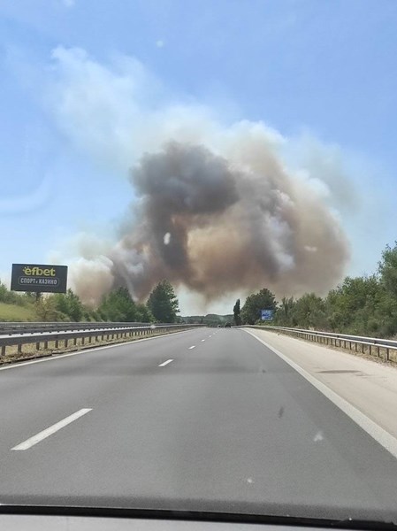 Според информацията, огънят се разпространява бързо, създавайки опасни условия за пътуващите в този участък. Въпреки усилията на пожарните екипи, ситуацията остава критична, като пожарът продължава да гори интензивно.