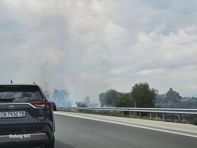 Пламъците се разпространяват в близост до пътното платно, като силният дим създава опасност за видимостта и безопасността на движение. Екипи на Регионалната дирекция "Пожарна безопасност и защита на населението" вече са на място и работят по овладяване на огъня. По първоначални данни не се съобщава за пострадали хора или нанесени материални щети по автомобили или инфраструктура.