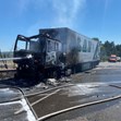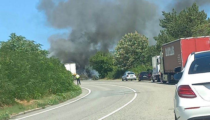 Причината е пожар на ТИР, при който се издигат гъсти черни пушеци.
