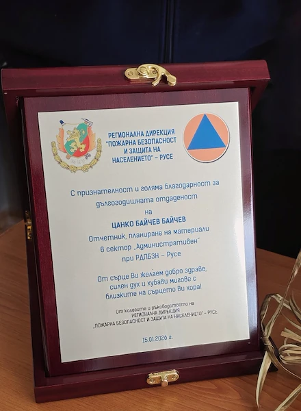 Регионалната дирекция "Пожарна безопасност и защита на населението" (РД ПБЗН) – Русе изпрати в заслужена почивка дългогодишния си служител Цанко Байчев. На специална церемония днес ръководството и екипът на дирекцията отбелязаха края на неговия професионален път, започнал преди повече от четири десетилетия.