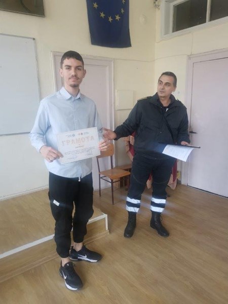 Двама възпитаници на СУ „Йордан Йовков“ в Русе - Иван Пламенов Иванов и Богомила-Сони Владимирова Кошовска, ученици в 11 клас, получиха своите отличия днес. Грамотите им бяха връчени от гл. инспектор Веселин Марков, началник на сектор „Пожарогасителна и спасителна дейност“ в Регионална дирекция „Пожарна безопасност и защита на населението“ - Русе. София Владиславова Иванова, ученичка в 11 клас в СУ „Панайот Волов“ – Бяла, бе удостоена с грамотата от гл. инспектор Свилен Рачев, началник на районната служба „ПБЗН“ в град Бяла.