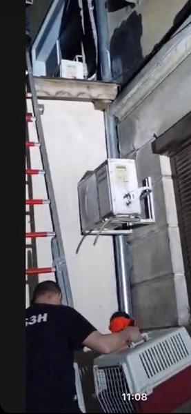 Животното започнало да се катери по фасадата на блока, използвайки външните тела на климатиците, но в един момент се оказало блокирано и започнало жално да мяучи за помощ.