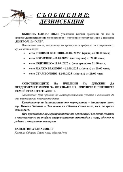 В село Борисово пръскането ще започне в 20:00 часа, а от 21:00 часа ще обработят и Юделник. Утре акцията ще продължи в селата Малко Враново и Стамболово. Координатор на дезинсекционното мероприятие е заместник-кметът Михаил Чиликов.