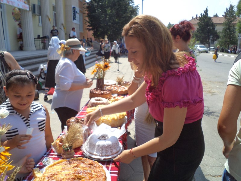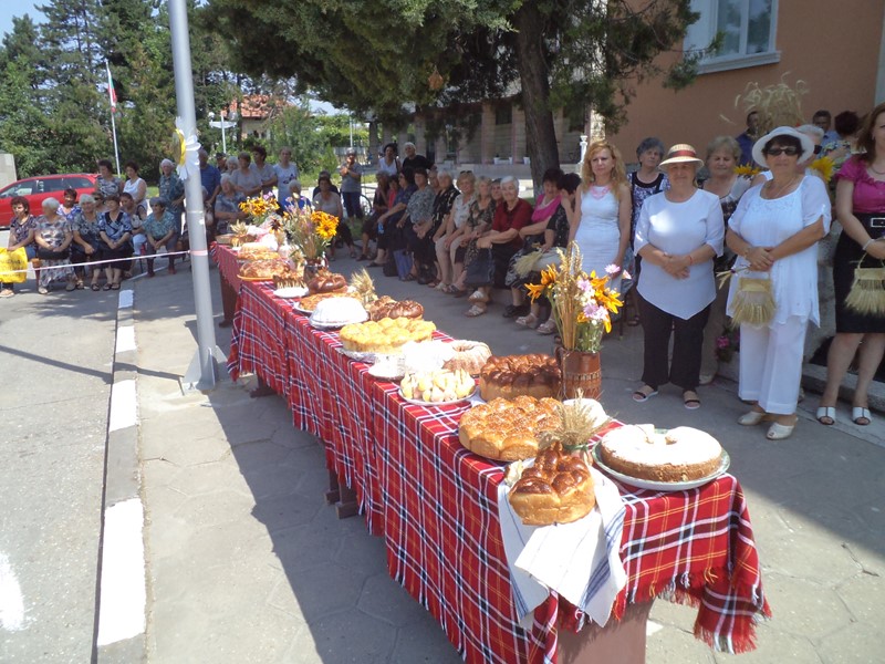 Активистки от пенсионерския клуб в селото бяха подготвили богата изложба от баници, погачи и сладкиши – символ на всичко, което се произвежда от житото.