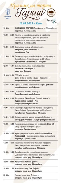Програмата на празника продължава с концерт на Михаела Филева в 19:30 часа пред Община Русе, след което публиката ще забавлява групата Deep Zone Project. Финалът на четвъртото издание на Празника на торта "Гараш" ще бъде впечатляващо лазерно шоу на Анди Фолкнър в 22:00 часа на площад "Свобода".