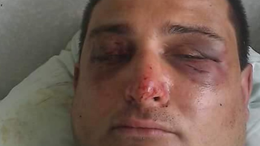 Полицията овладява ситуацията, а младият мъж е настанен в болница. Има четири шева на главата, счупен зъб, двете му очи са лепени.
