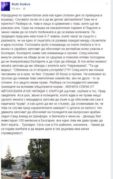 С цялата си наглост, тея двамата започват да обясняват на полицията как въпросния арабин (Адил Саид Ахмед ал Шанфари, а биячката е жена му - Деница) бил инвестирал 100 милиона в България, все едно това им дава право да бият хората... Трагедия. Сега съм в 5то районно, насинена... Чакам да си подам жалбата и да видим дали в тая държава има капка справедливост."