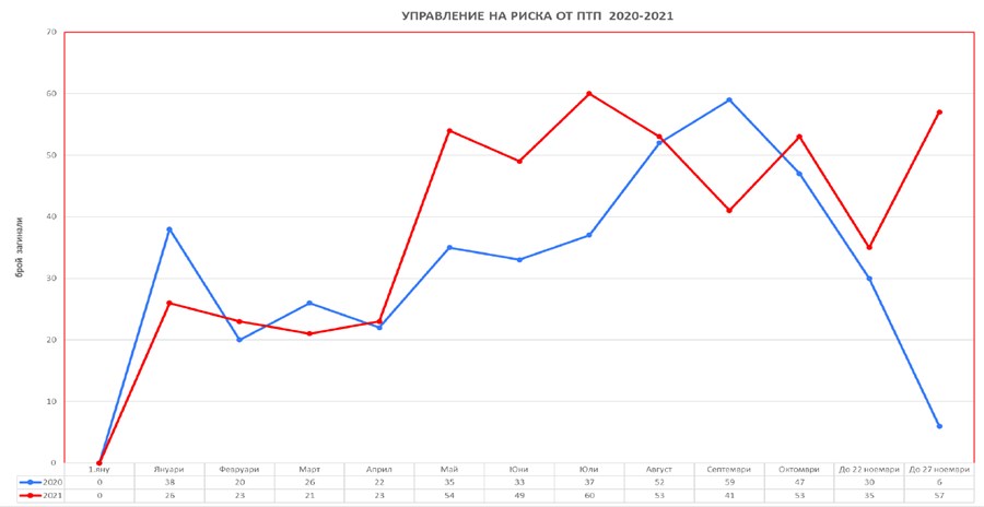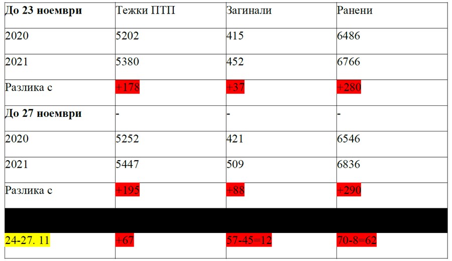 Експертите на Института за пътна безопасност в свой анализ предизвестиха тежката катастрофа на АМ „Струма“. През август месец 2021 г. се констатира лавинообразно увеличаване на пътнотранспортния травматизъм /виж графика №1/ за периода май-август 2021 г. спрямо същия период на 2020 г. Загиналите от ПТП лица са с почти 60 души повече. За последните 10 години подобно явление не е констатирано. В този период са изпратени 11 доклада с вх. № 03-08-122/10.06.2021 до министъра на регионалното развитие и благоустройството г-жа Комитова, с които я информираме за конкретни дефицити при изграждането и ремонтирането на автомагистралите и първокласните пътища в страната. Докладите са изготвени от международен пътен одитор. Реакция от МРРБ нямаше, а жертвите продължаваха да се увеличават.