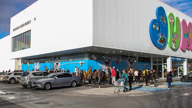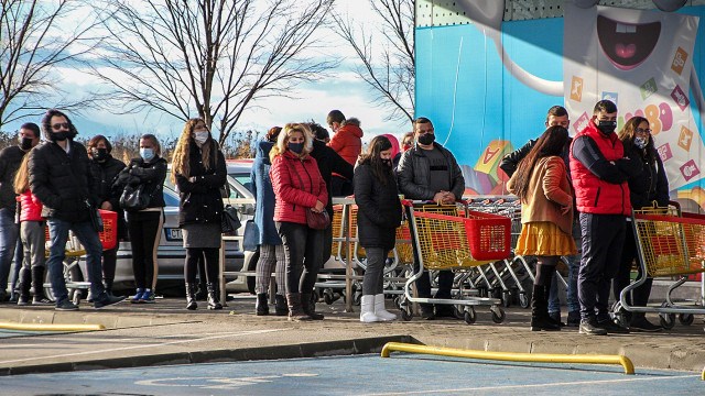 Униформени и служители на магазина следяха зорко за дистанция на опашката и услужливо подмятаха забележка на клиенти, забравили за противоепидемичните мерки.