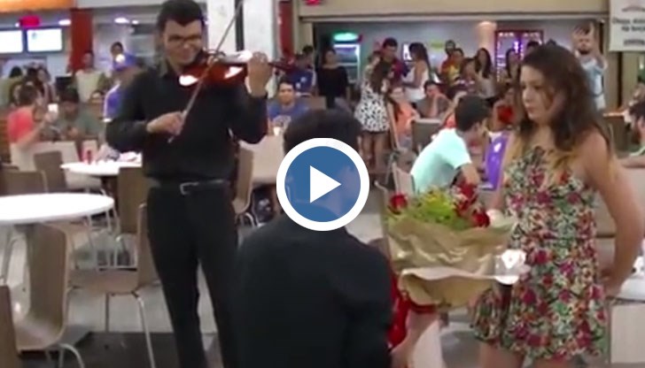 Мъж бе заснет как предлага брак на приятелката си в заведение за бързо хранене в Бразилия, докато цигулар прави серенада за нея. Но в крайна сметка той не получи реакцията, за която се бе надявал - любимата му поклати неодобрително глава и се отдалечи, пише БЛИЦ.