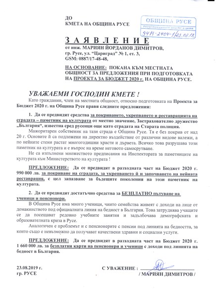 Като гражданин и член на местната общност на 23.08.2019 г. с писмо вх. № 94М-2404-1 направих две предложения за включване на дейности в проекта за БЮДЖЕТ 2020 г. на Община Русе.