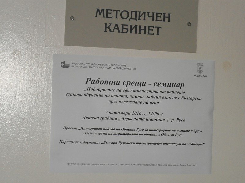 „Подобряване на ефективността от ранното езиково обучение на децата, чийто майчин език не е български чрез въвеждане на игри“ бе темата на работна среща – семинар, която се състоя на 7 октомври 2016 г. в детска градина „Червената шапчица“, гр. Русе.