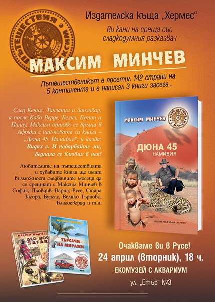 Във вторник, 24 април, от 18:00 часа в Екомузей с аквариум ще се състои премиерата на новата книга на пътешественика и дългогодишен генерален директор на БТА Максим Минчев „Дюна 45“ на издателство „Хермес“.