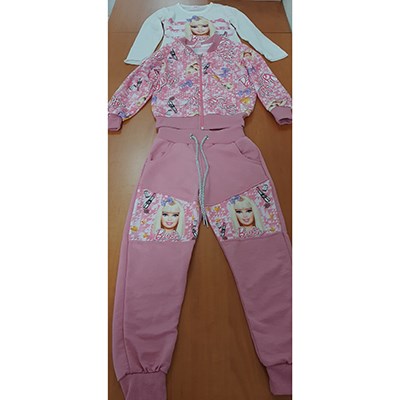 Детски комплект от панталон, бяла блуза и розов суичър с цип, с надпис "Barbie" и щампа на кукла – бранд Barbie и неизвестна страна на произход;